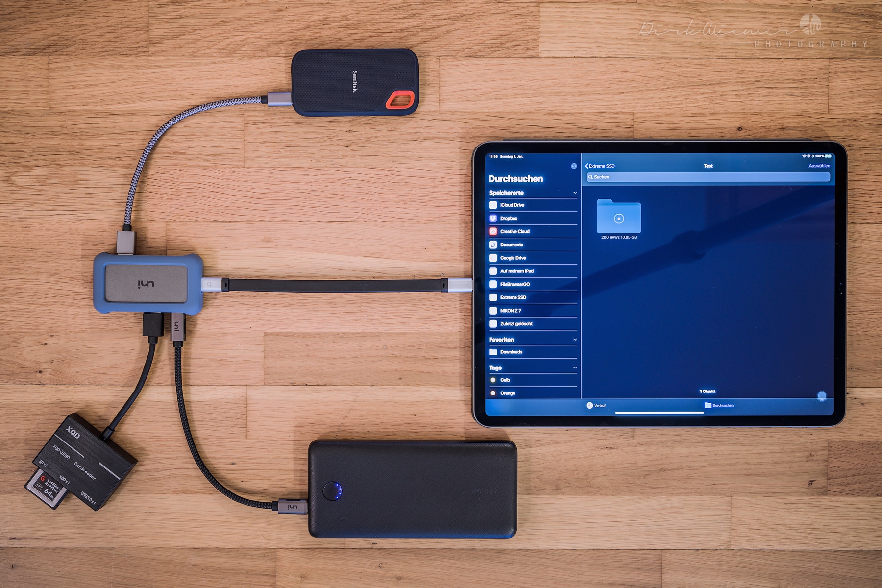 Info: Beim Einsatz des “Lightning to USB 3 Camera Adapter” und anderen Speichermedien als die beiden von mir getesteten SSDs kann es wohl vorkommen, dass allein die Stromversorgung über den USB-C Hub für die iOS/iPadOS Geräte nicht ausreichend ist. Hier soll, glaubt man den Kommentaren zu dem oben erwähnten YouTube-Video, eine weitere Energiezufuhr (Netzteil oder weitere Powerbank) über den Lightning-Port des Apple Adapters helfen. Da das aber bei mir nicht der Fall war, konnte ich das ebenfalls nicht weiter testen.