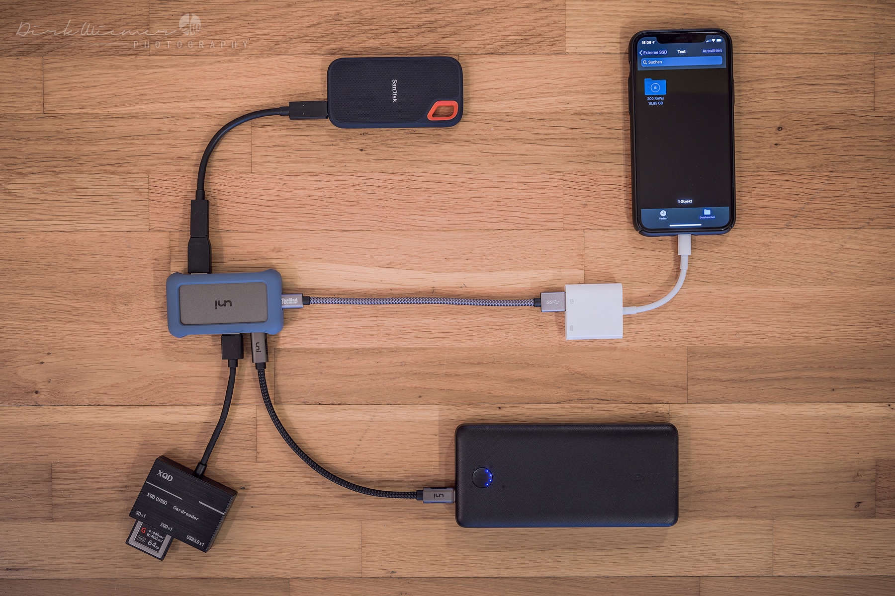 Das ganze hatte ich schon so ähnlich wie im Artikel beschrieben verstöpselt, dass ich vom iPhone auf die SSD zugreifen konnte.