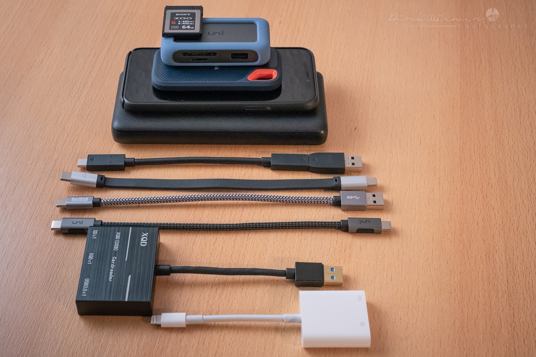 Aktuell habe ich übrigens XQD Speicherkarten von Sony im Einsatz und habe daher mit denen getestet. Das geht natürlich auch mit CF oder SD Speicherkarten. Bei Letzteren kann man sich sogar den separaten Kartenleser sparen, da die unten beschrieben Lösung einen SD / MicroSD Kartenleser gleich mit an Board hat (habe ich allerdings nicht getestet). Ich vermute hier sind die Übertragungsraten deutlich langsamer.