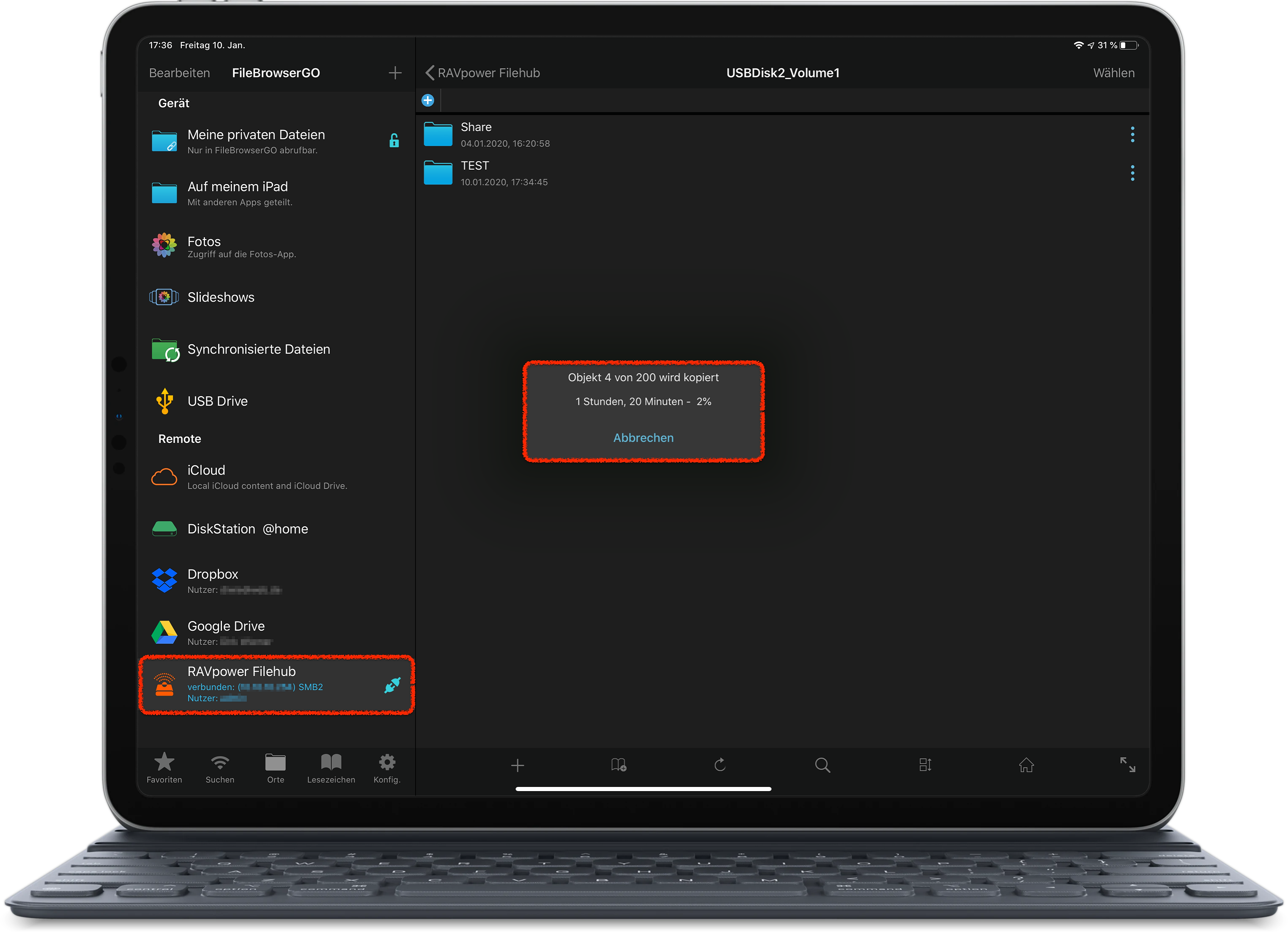 Das dort beschriebene Setup verlangt allerdings einen entsprechend großen und freien Zwischenspeicher auf dem iOS/iPadOS Gerät was zu unvorhersehbaren Komplikationen auf Reisen führen könnte. Ich wollte aber gern davon unabhängig sein und vor allem die Dateien in einem Kopiervorgang von der Speicherkarte auf das externe Backup-Gerät sichern! Ganz egal wie viel freien Speicherplatz ich auf dem mobilen Device auch habe, so der Plan.